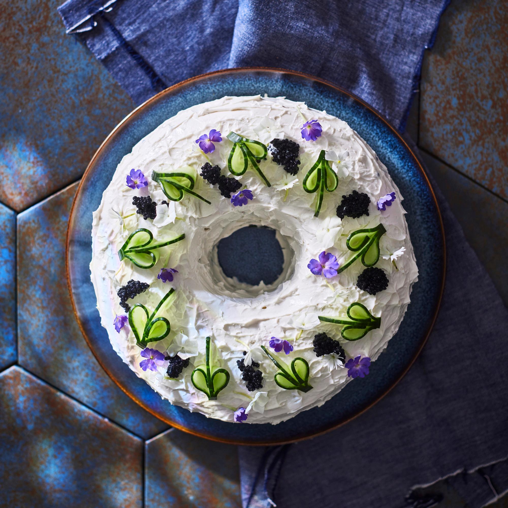 - Koristele voileipäkakkukranssi kurkkuviuhkoilla, merileväkaviaarilla ja kukilla.