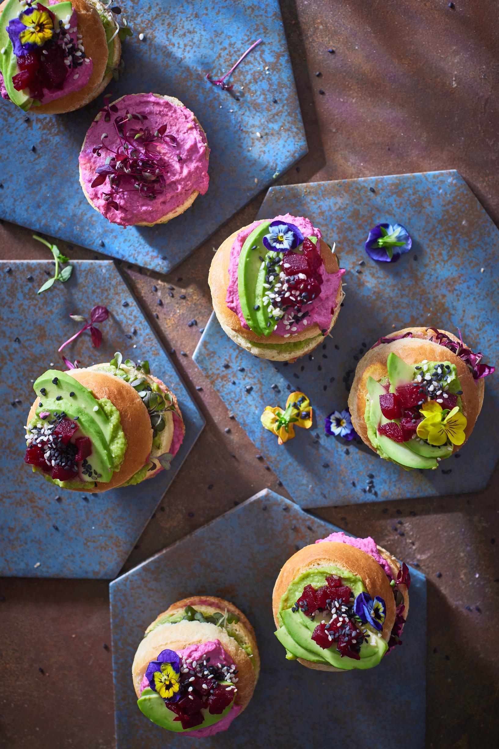 - Levitä kunkin sämpylän toiseen väliin hummusta ja toiseen guacamolea sekä versoja. Sipaise päälle vielä toista tahnoista ja koristele avokadoviipaleilla, punajuurikuutioilla, versoilla, kukilla ja seesaminsiemenillä.