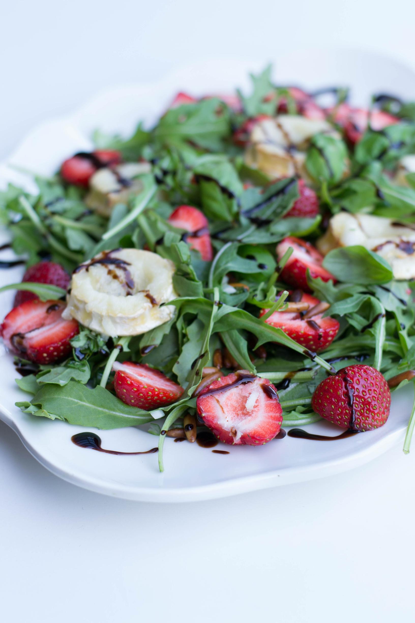 - Ripottele salaatin pinnalle oliiviöljyä ja balsamicokastiketta. Viimeistele vuohenjuusto-mansikkasalaatti ripauksella mustapippuria.