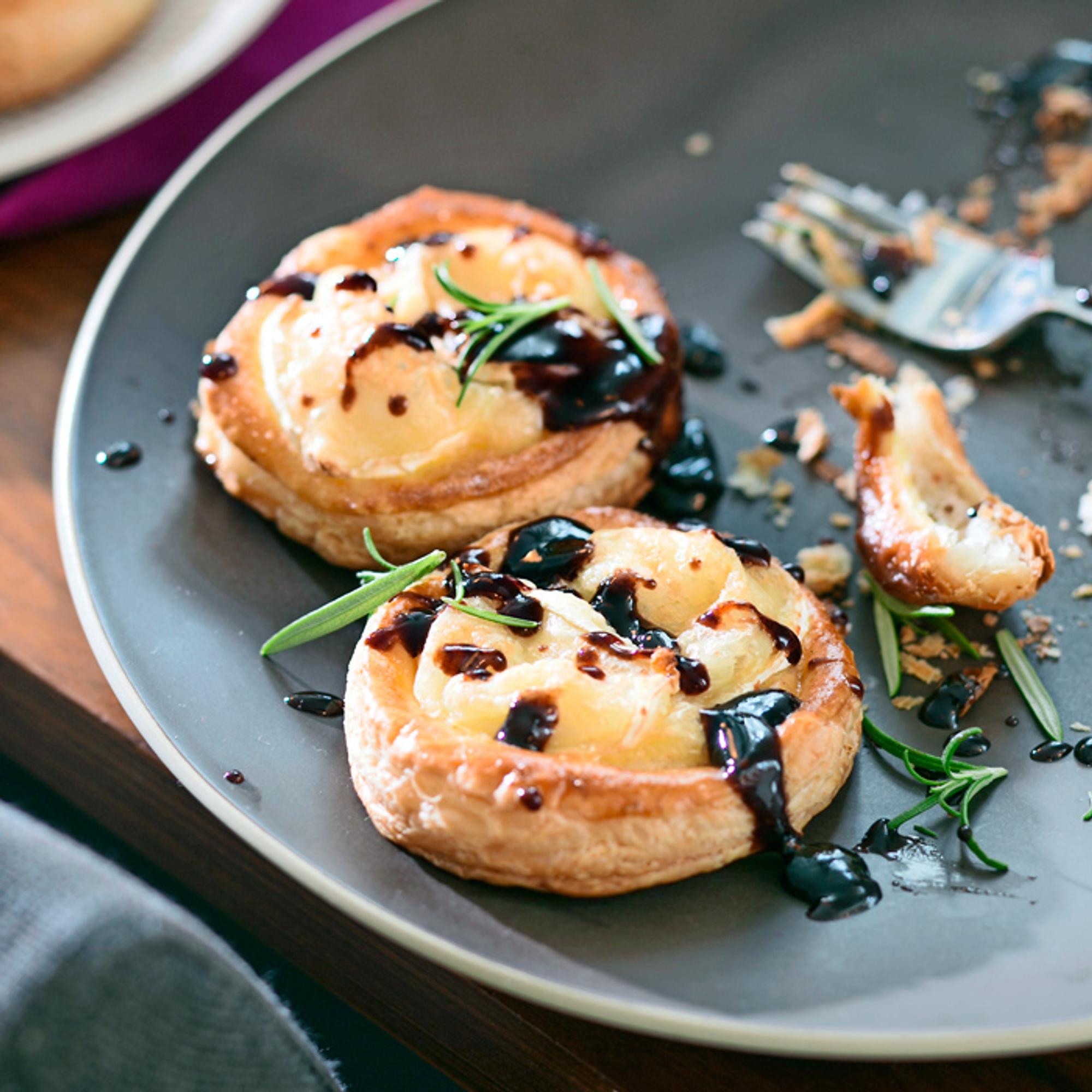 Rapsakka lehtitaikina saa ylleen sulaa vuohenjuustoa ja happamanmakeaa kirsikka-balsamicosiirappia. Näyttävät vuohenjuustotartaletit kruunaavat juhlan kuin juhlan!