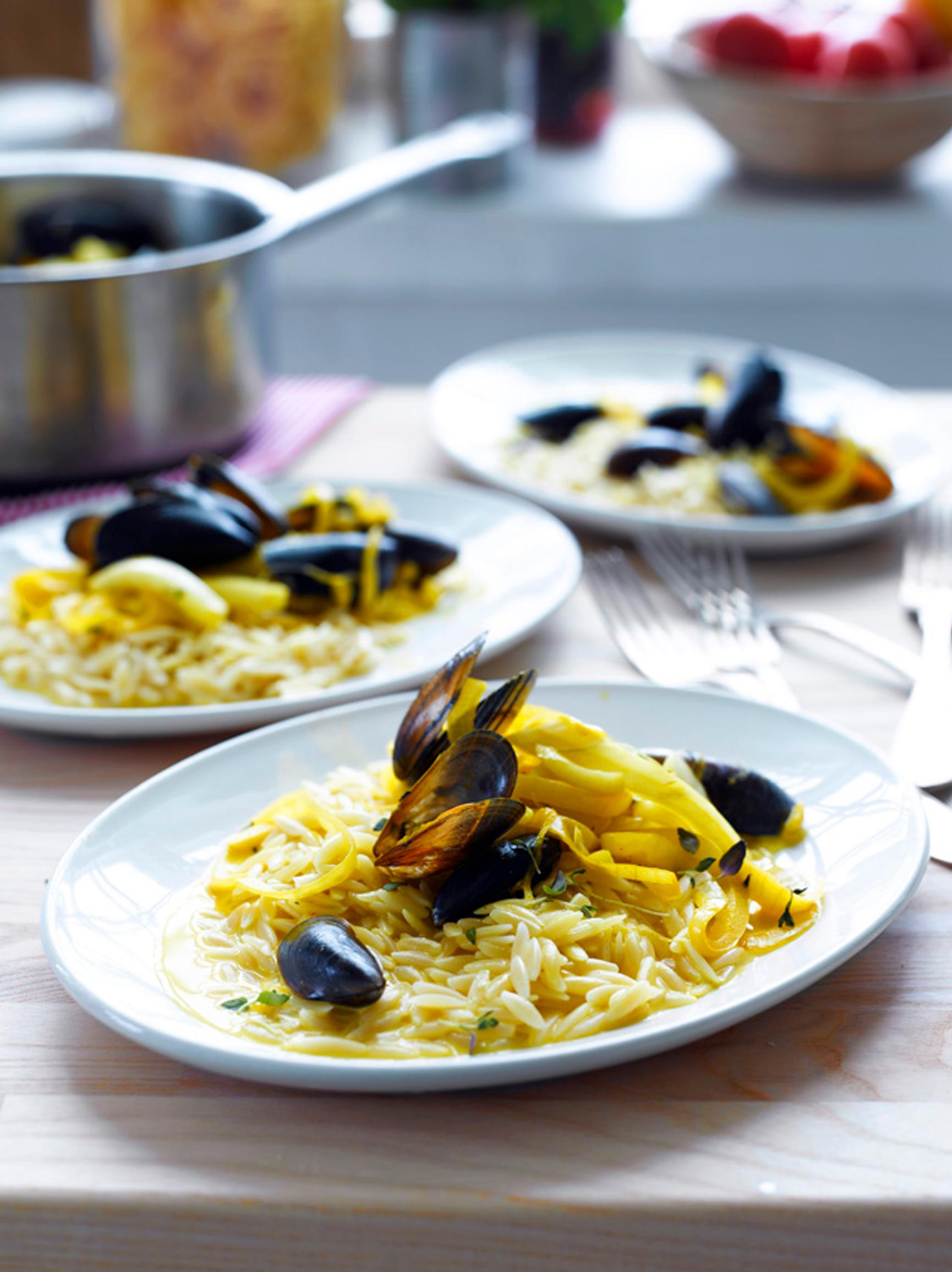 Sinisimpukat ovat parhaimmillaan talvikuukausina. Osta ne tuoreina kalatiskiltä tai nappaa valmiiksi pestyjä pakastealtaasta. Tarjoa simpukat kastikkeessa orzon kanssa. Orzo on erehdyttävästi riisiltä näyttävää pastaa. Siksi sitä kannattaa etsiä joko pasta- tai riisihyllystä.