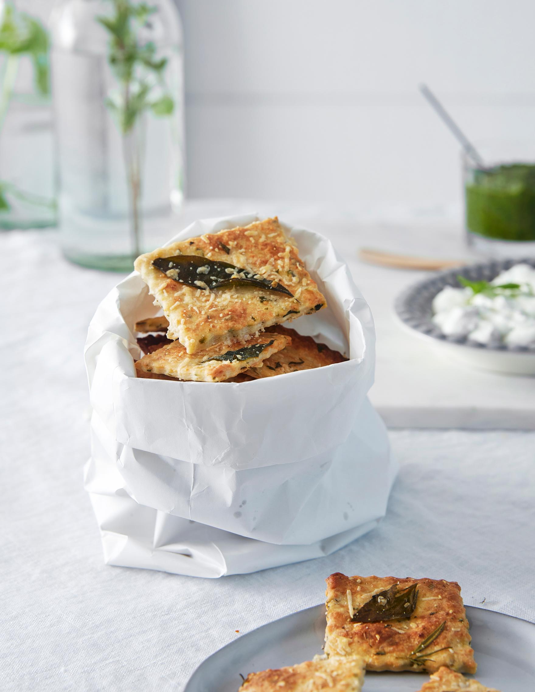 Rapeat yrtti-parmesaaninäkkärit on mainio tarjottava juhlien buffetpöydässä esimerkiksi erilaisten levitteiden ja tahnojen kanssa. Näihin herkkuihin voit hyödyntää yrttipuskien jämät! Pakkaa purkkiin ja säilytä kuivassa.