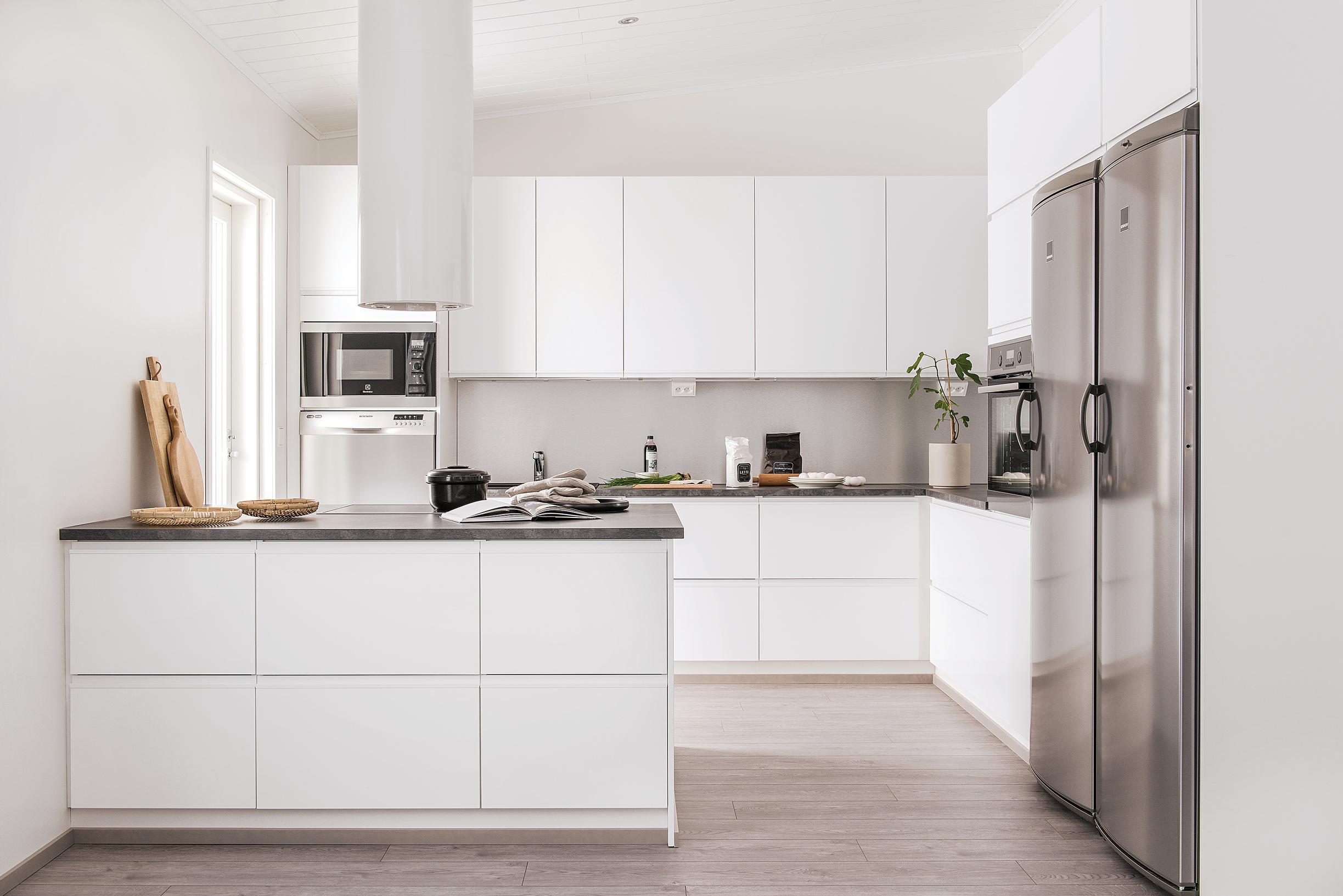 Moderni ja skandinaavinen Tanhualan talo hehkuu valoa – ajattomat keittiökalusteet ovat piste iin päällä